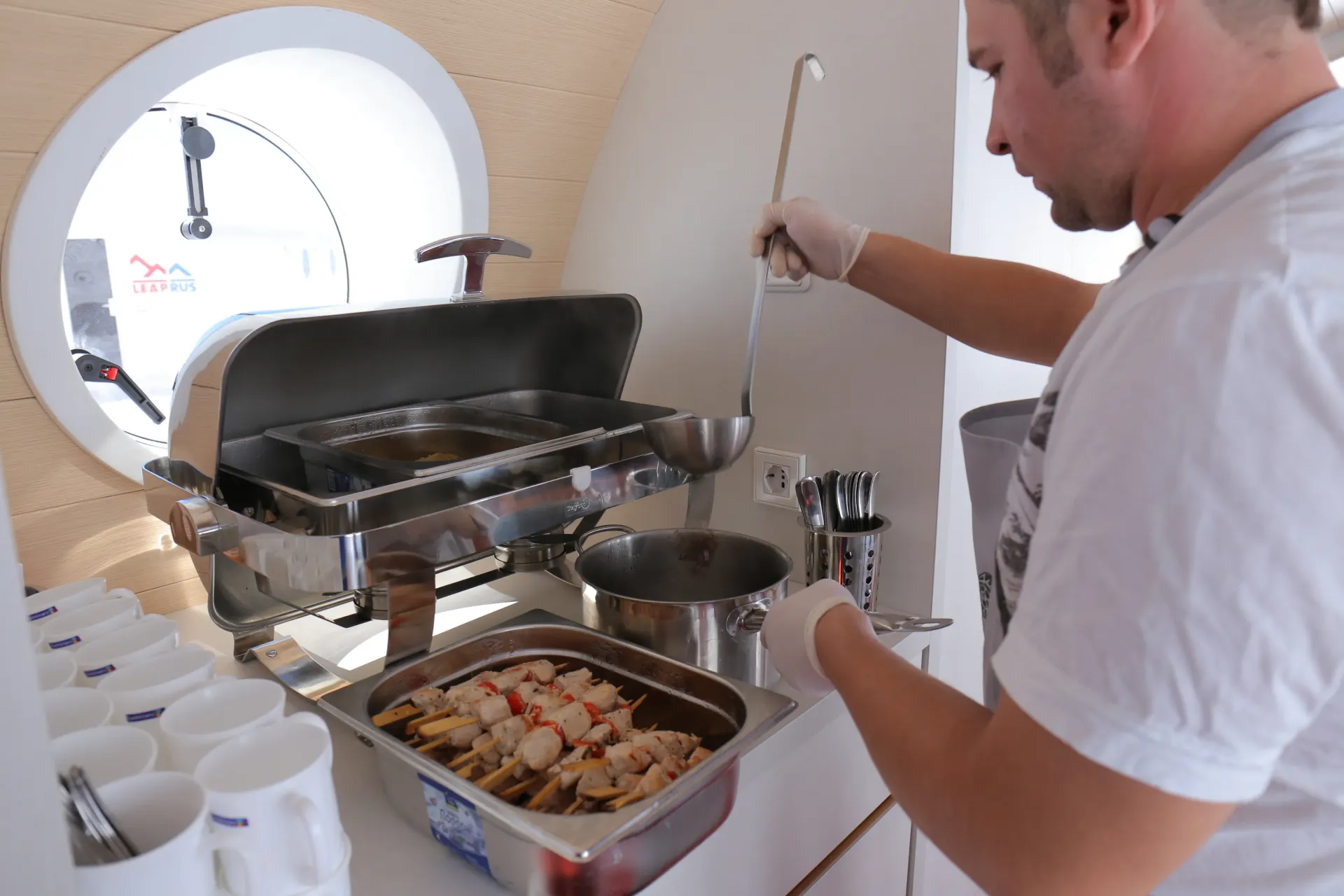 Во время проживания в Cosmos Elbrus Leaprus Camp всем гостям предоставляется трехразовое питание. Завтраки, обеды и ужины организованы в просторном модуле-гостиной на территории приюта, с панорамным видом на горы Кавказского хребта. Модуль оборудован столиками и скамейками, где помимо посещения "шведской линии" можно воспользоваться чайно-кофейной станцией, налить в термос кипяток, перекусить легкими снеками. Гостиная открыта с 7:00 до 20:00.